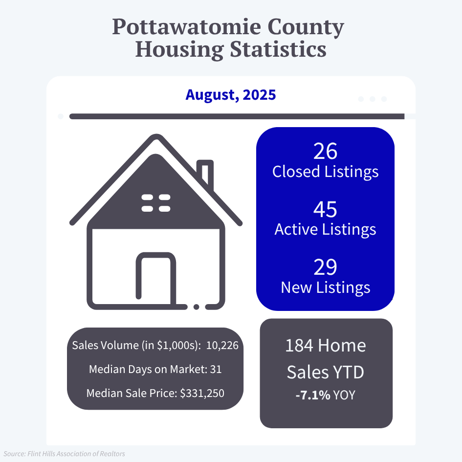 Quarter two and quarter three provided a strong season for home sales, and around 85 Pottawatomie County homes were closed in each of these quarters individually. These totals compare favorably to the quarter one home sales total, which was around 38 homes, according to the Flint Hills Association of Realtors. However, it is not atypical for home sale counts to peak in the warmer months, so we may see a downturn in home closings as we approach the end of the year and the beginning of 2026.